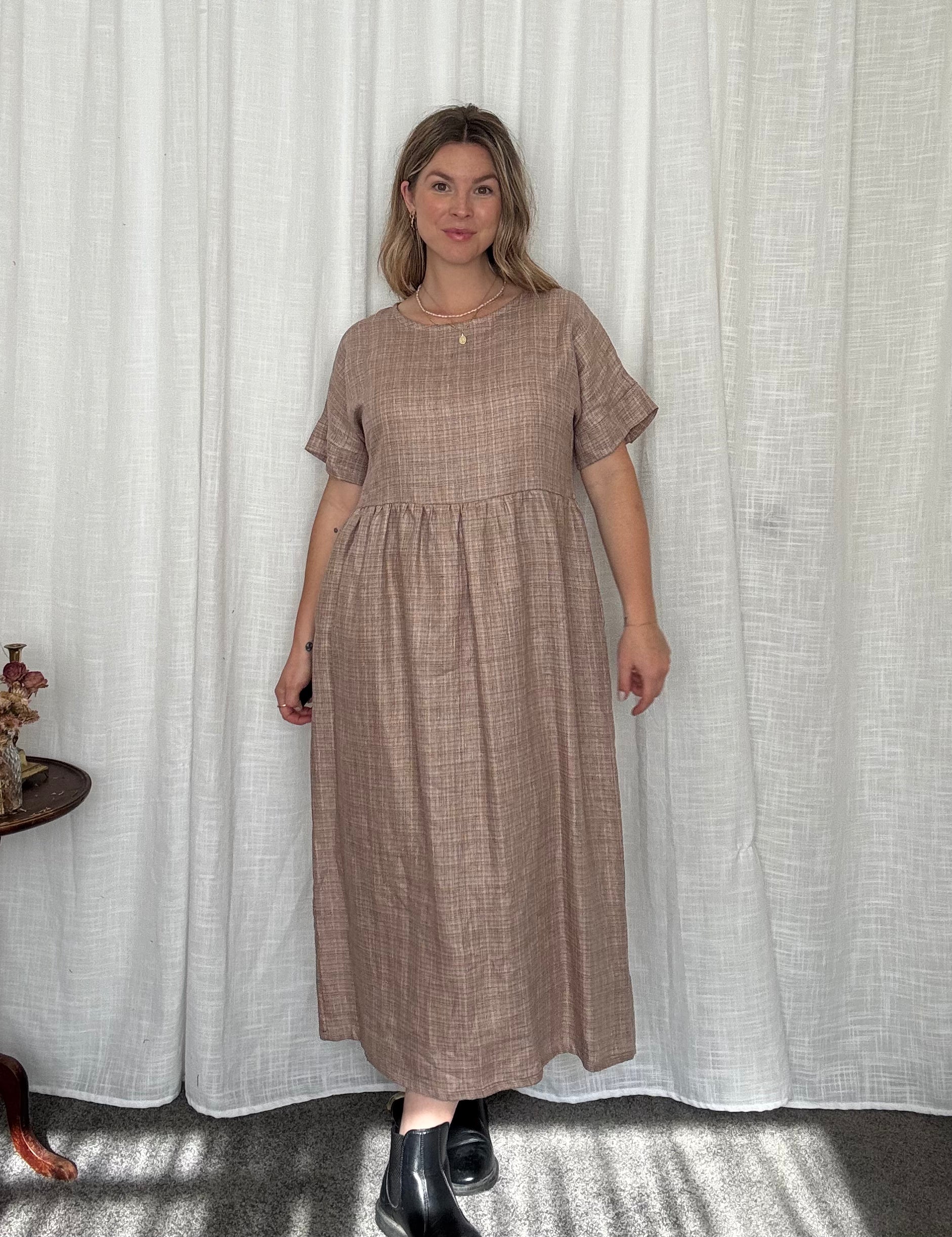 The Brunch Dress is an oversized, effortless style that will be your go-to for all occasions. She features a grown-on sleeve with a cuff finish. This dress includes inseam pockets and a slightly lowered waistline that flows into a relaxed midi-length skirt.
