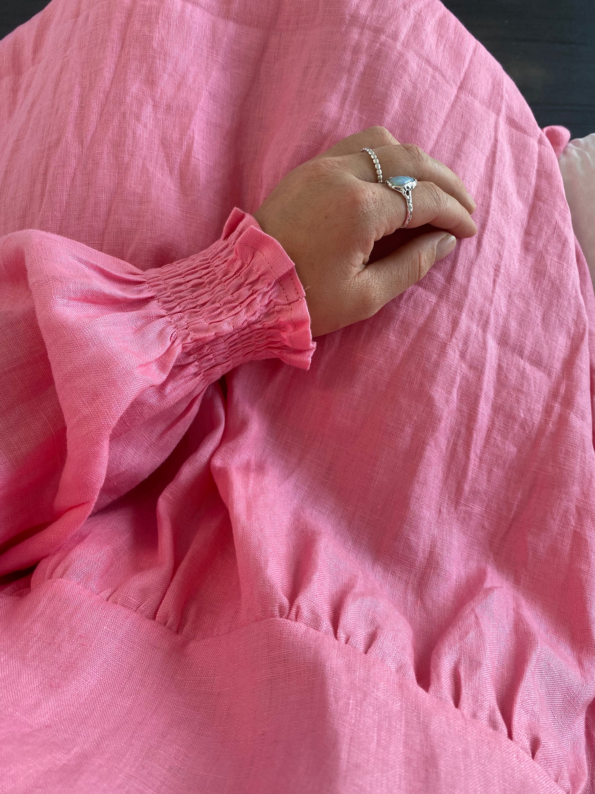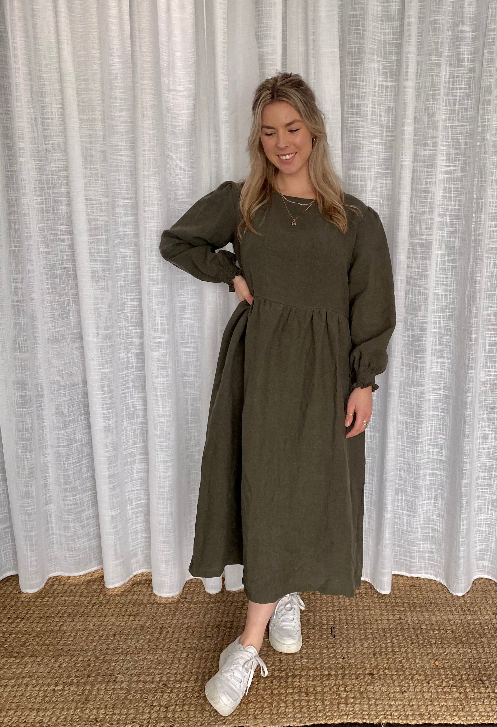 The Bailey Dress is a relaxed fitting dress, she has a full length sleeves with elasticated cuffs, a slightly lowered waistline, inseam pockets and finishes at a midi length.