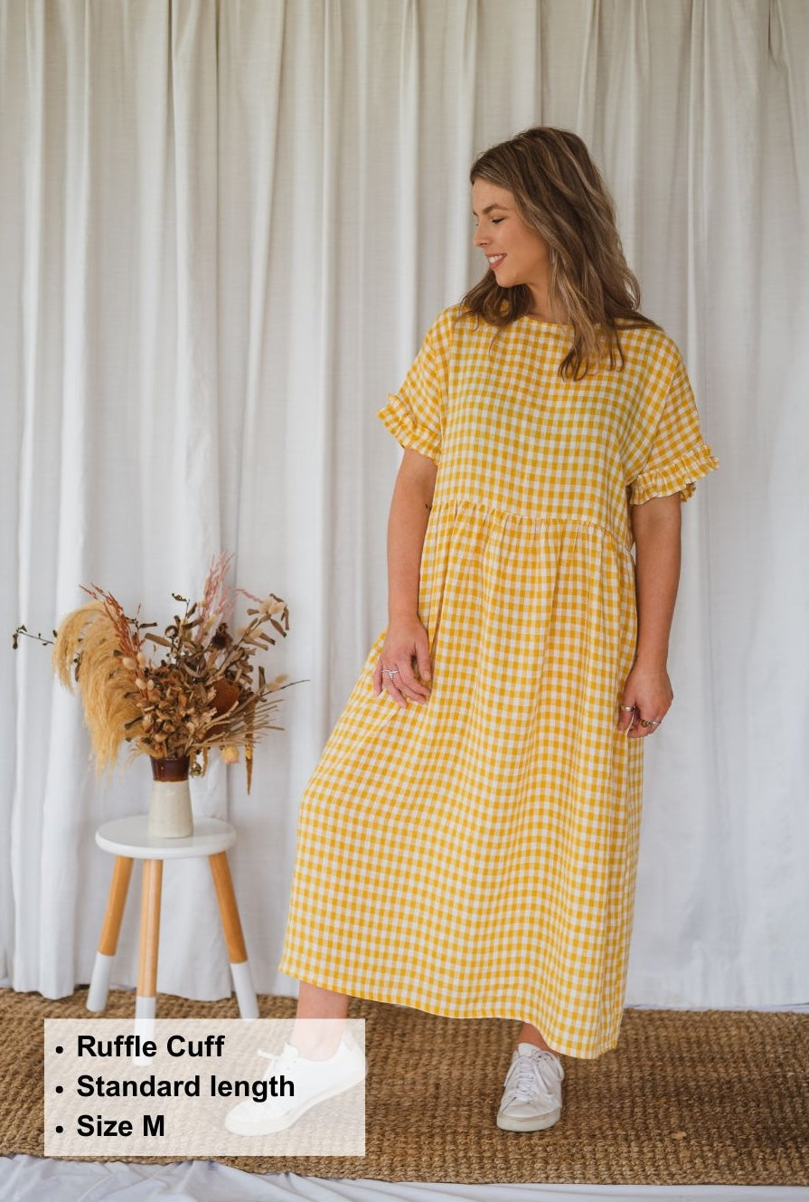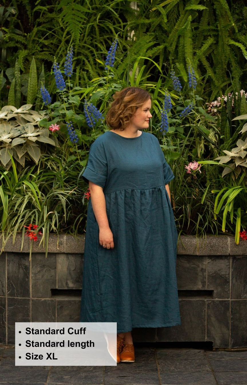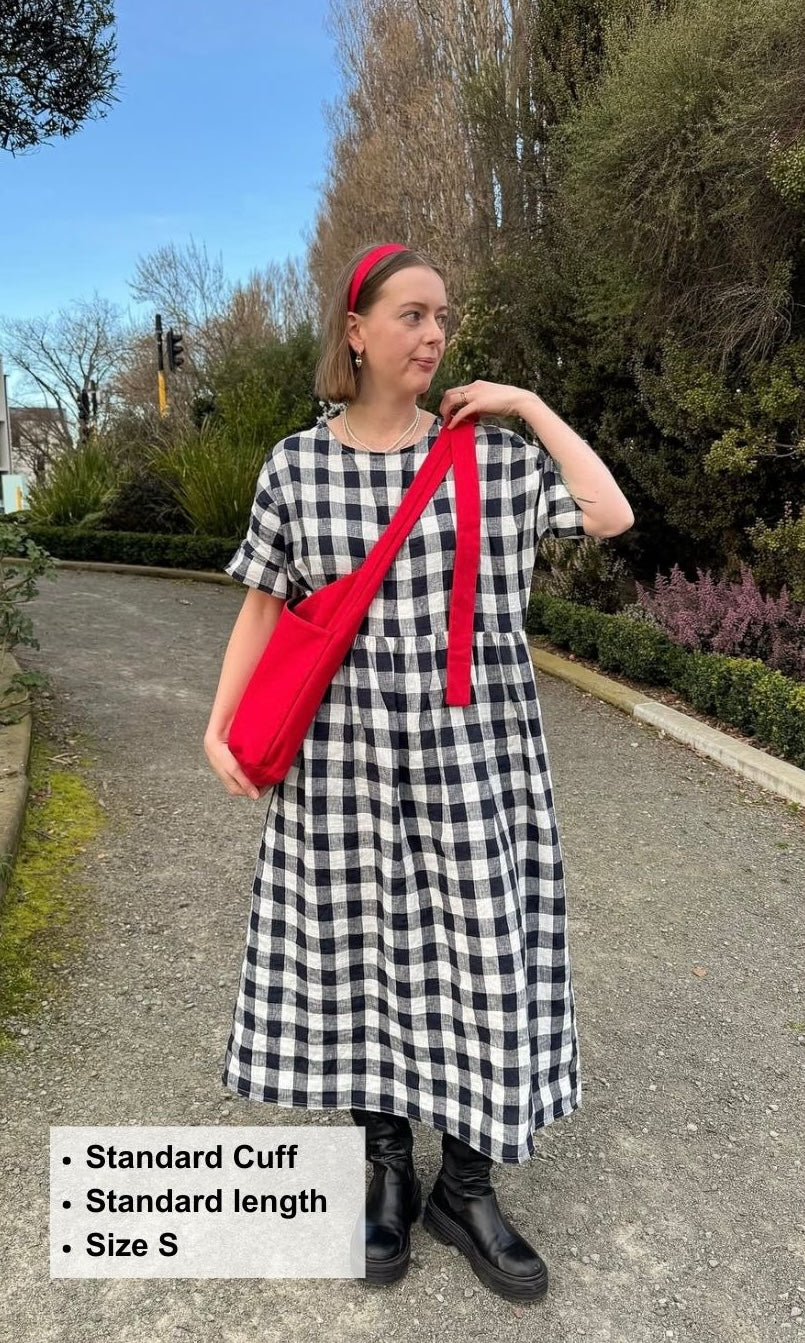 The Brunch Dress sewing pattern is a beginner friendly pattern. She features a grown-on sleeve with an option for a ruffle or cuff finish. This style has inseam pockets, a slightly lowered waistline flowing down to a midi length.
