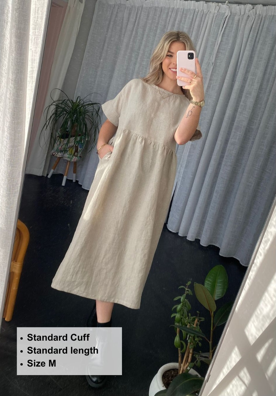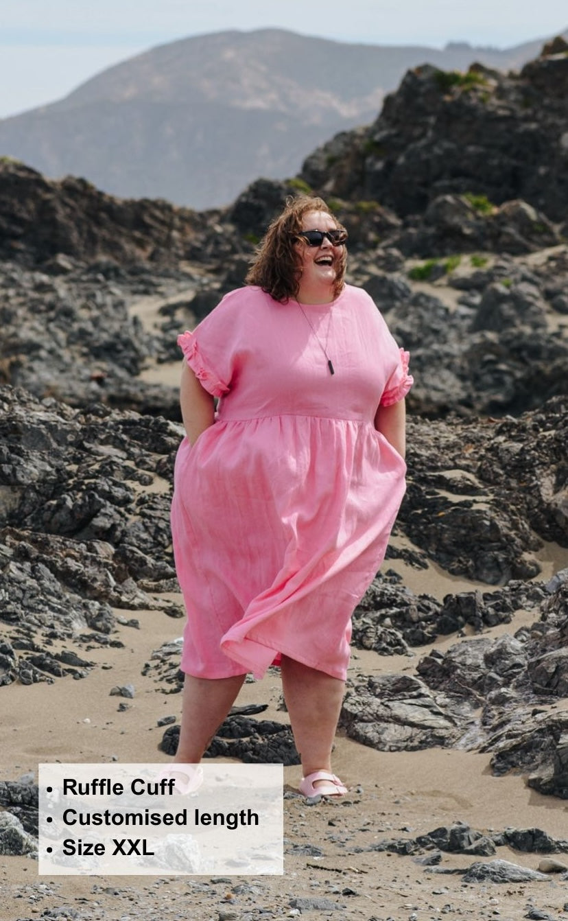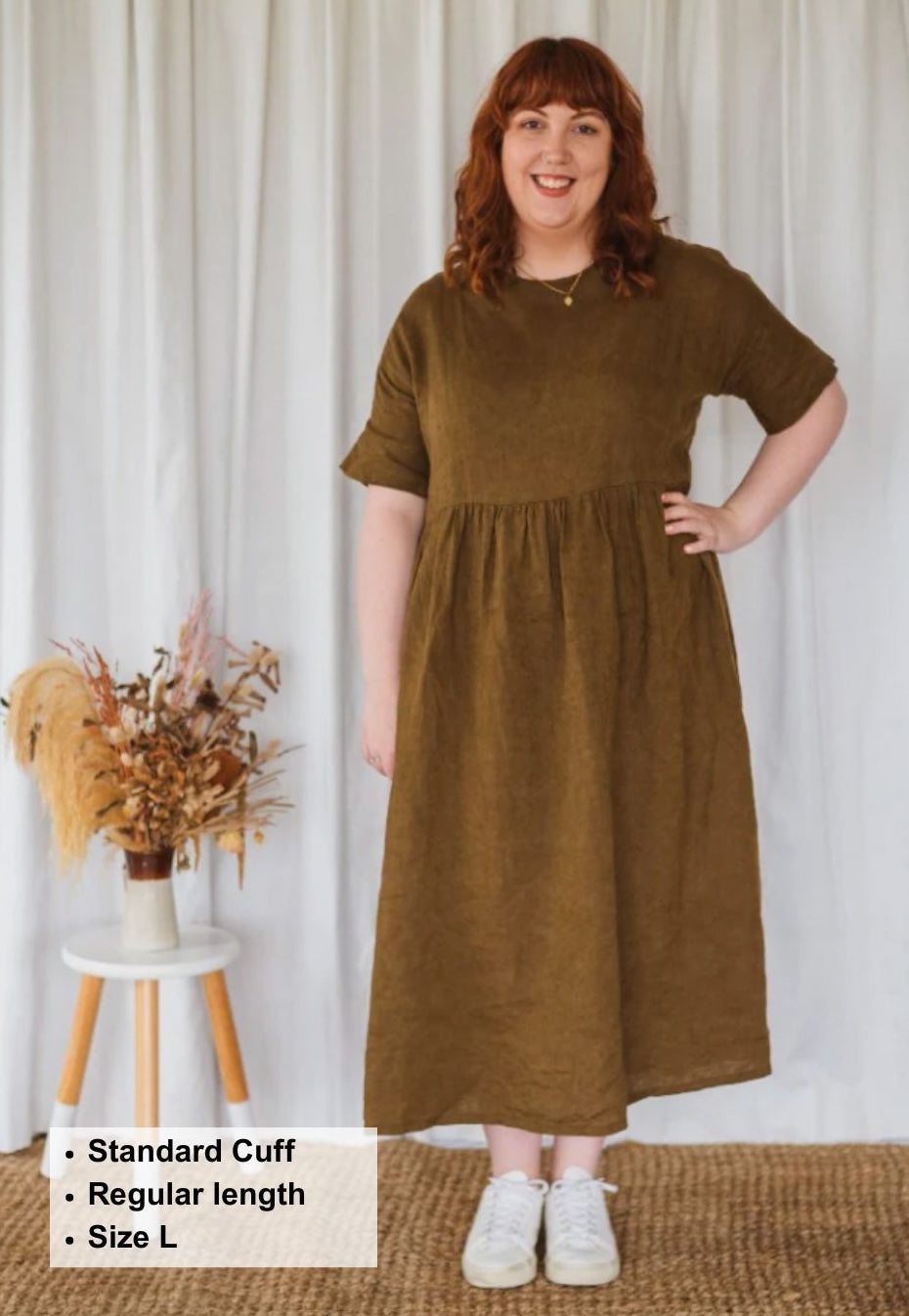 The Brunch Dress sewing pattern is a beginner friendly pattern. She features a grown-on sleeve with an option for a ruffle or cuff finish. This style has inseam pockets, a slightly lowered waistline flowing down to a midi length.