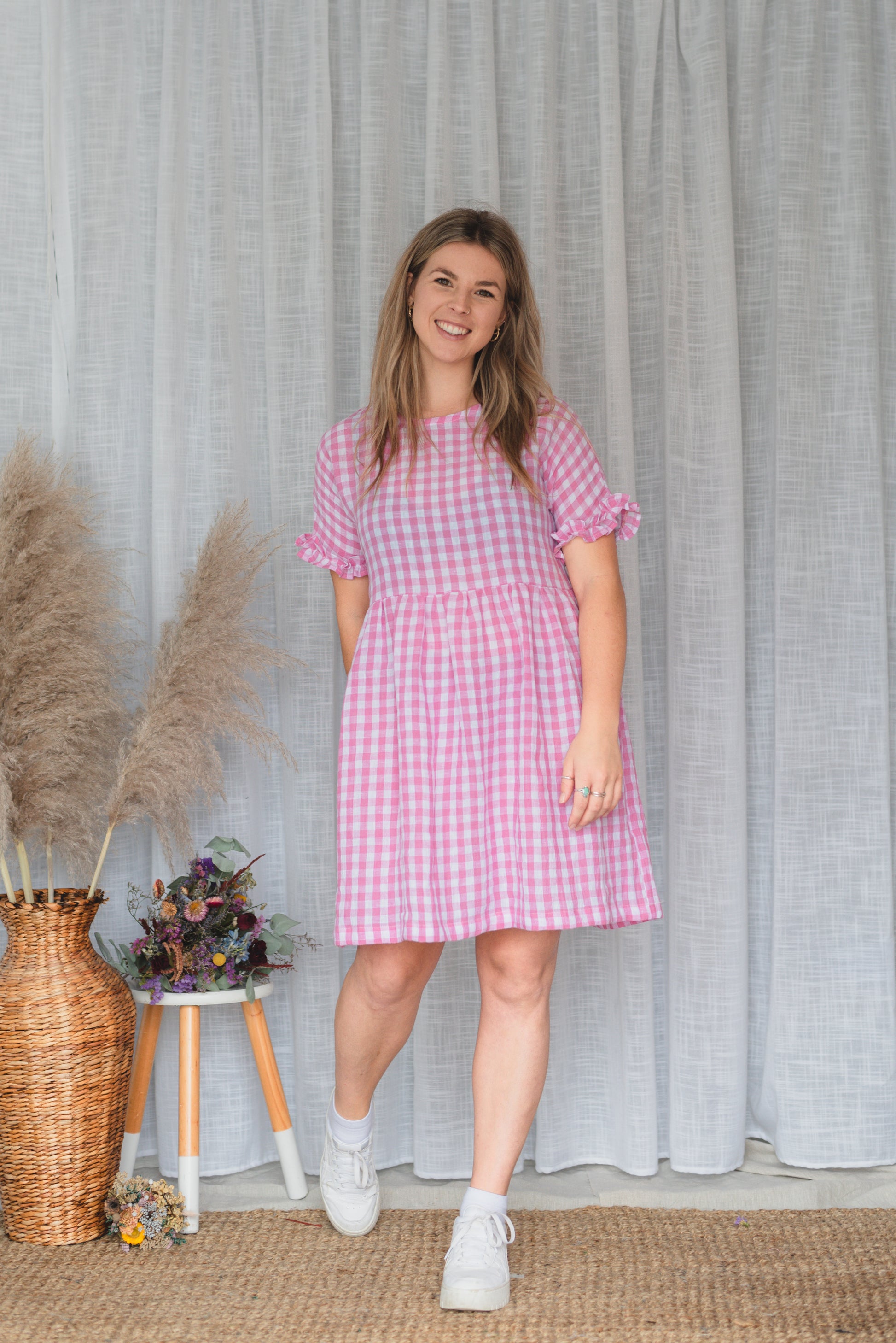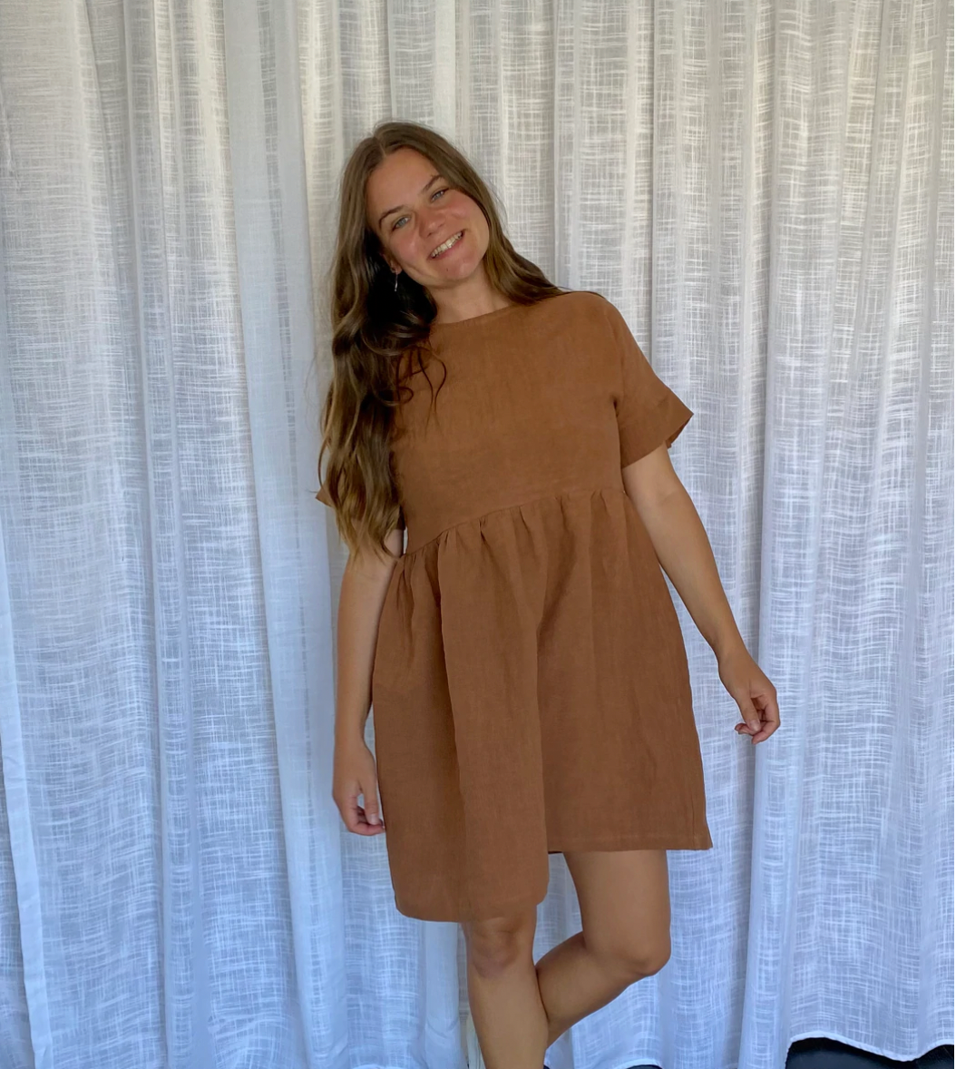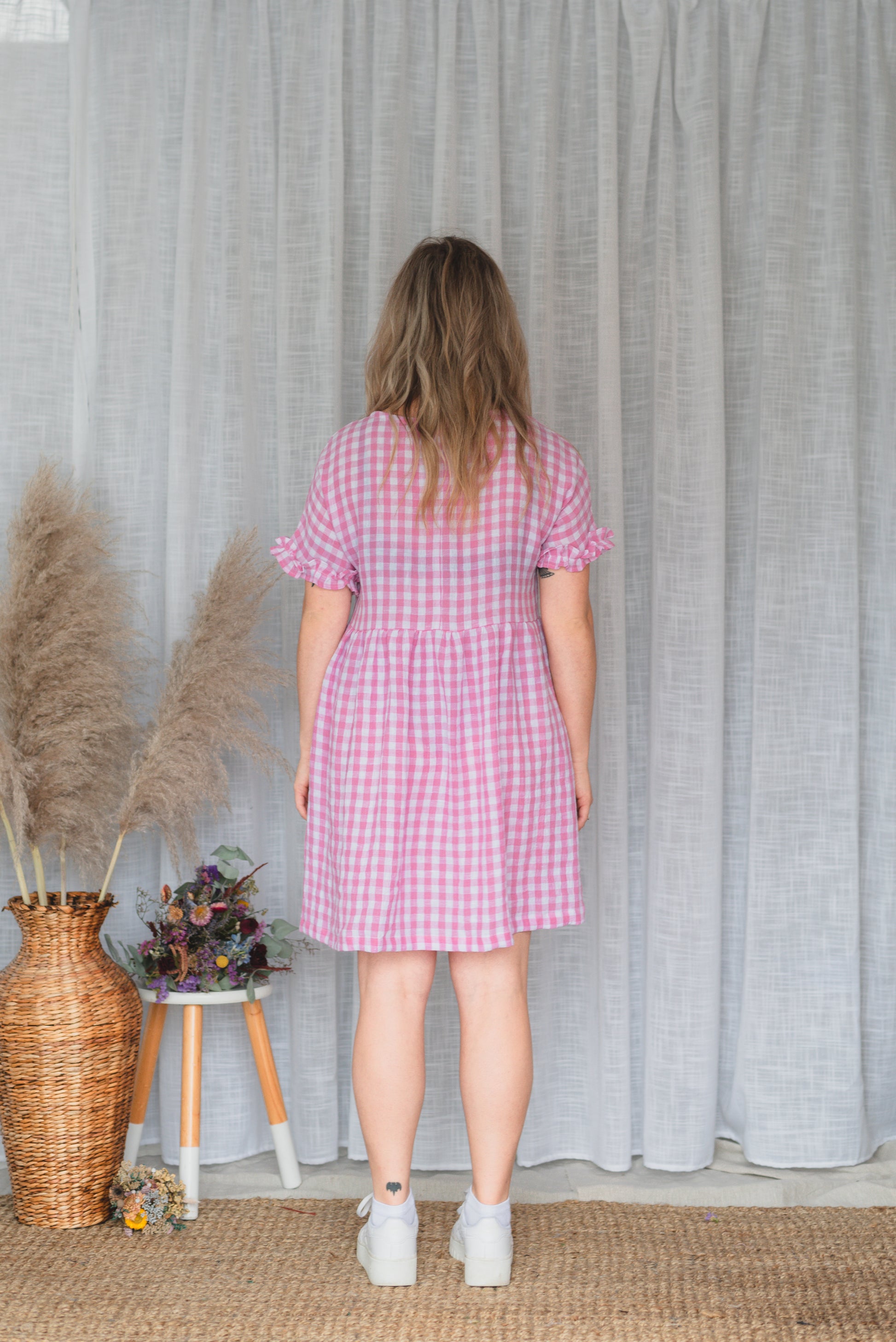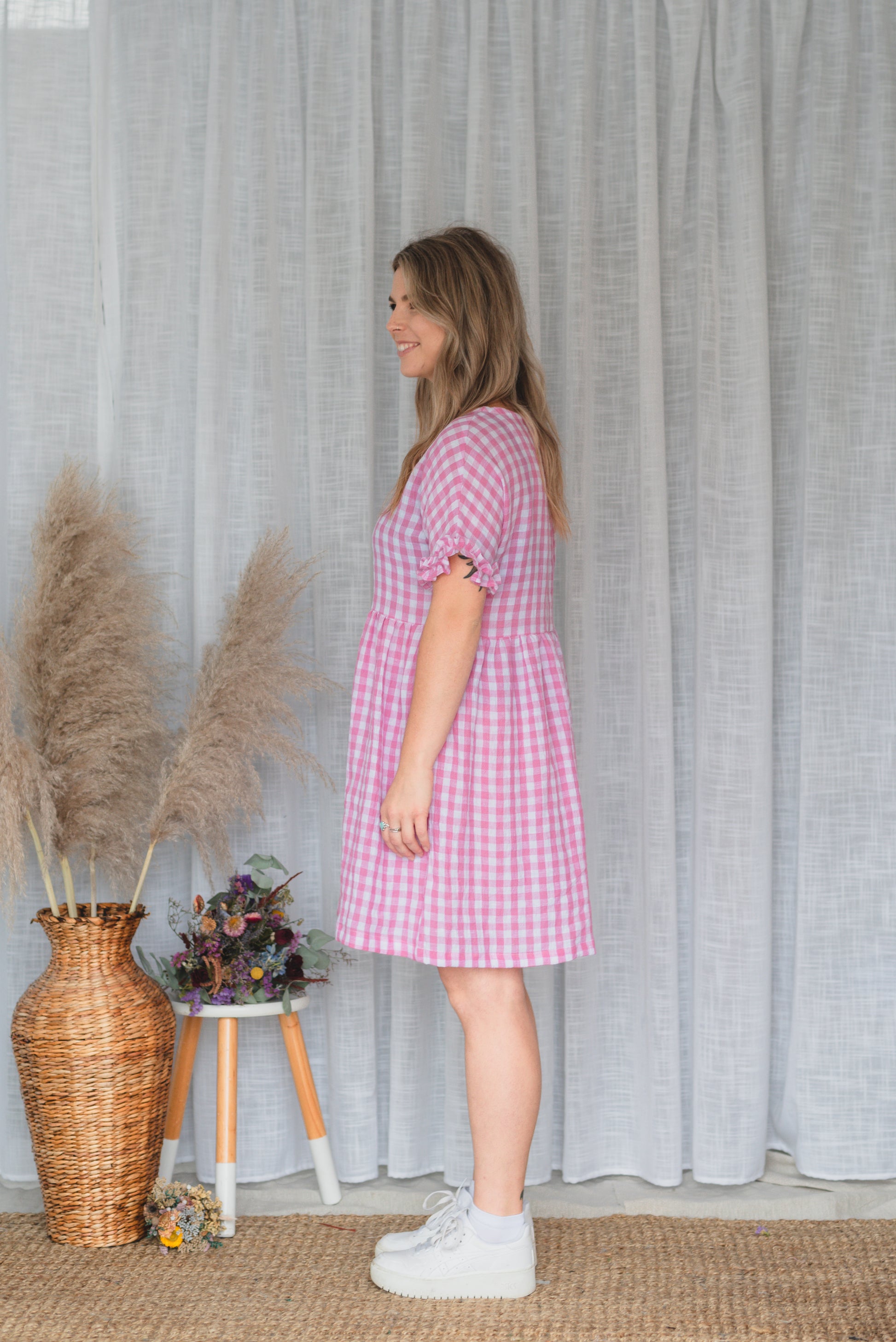 The Brunch Dress is a relaxed fitting dress, she features a grown-on sleeve with an option for a ruffled or cuff finish. She has a slightly lowered waistline, inseam pockets and finishes just above the knee.