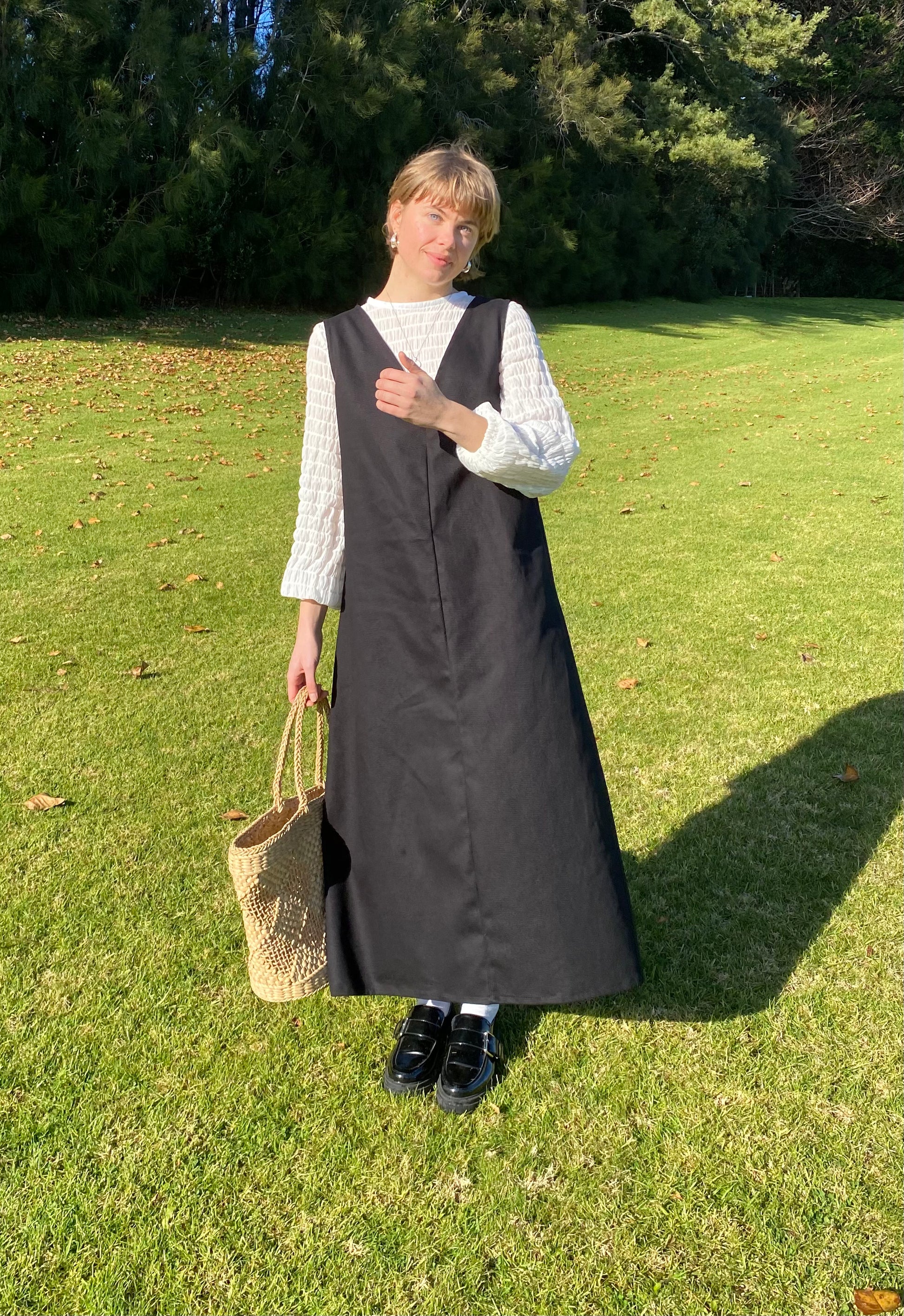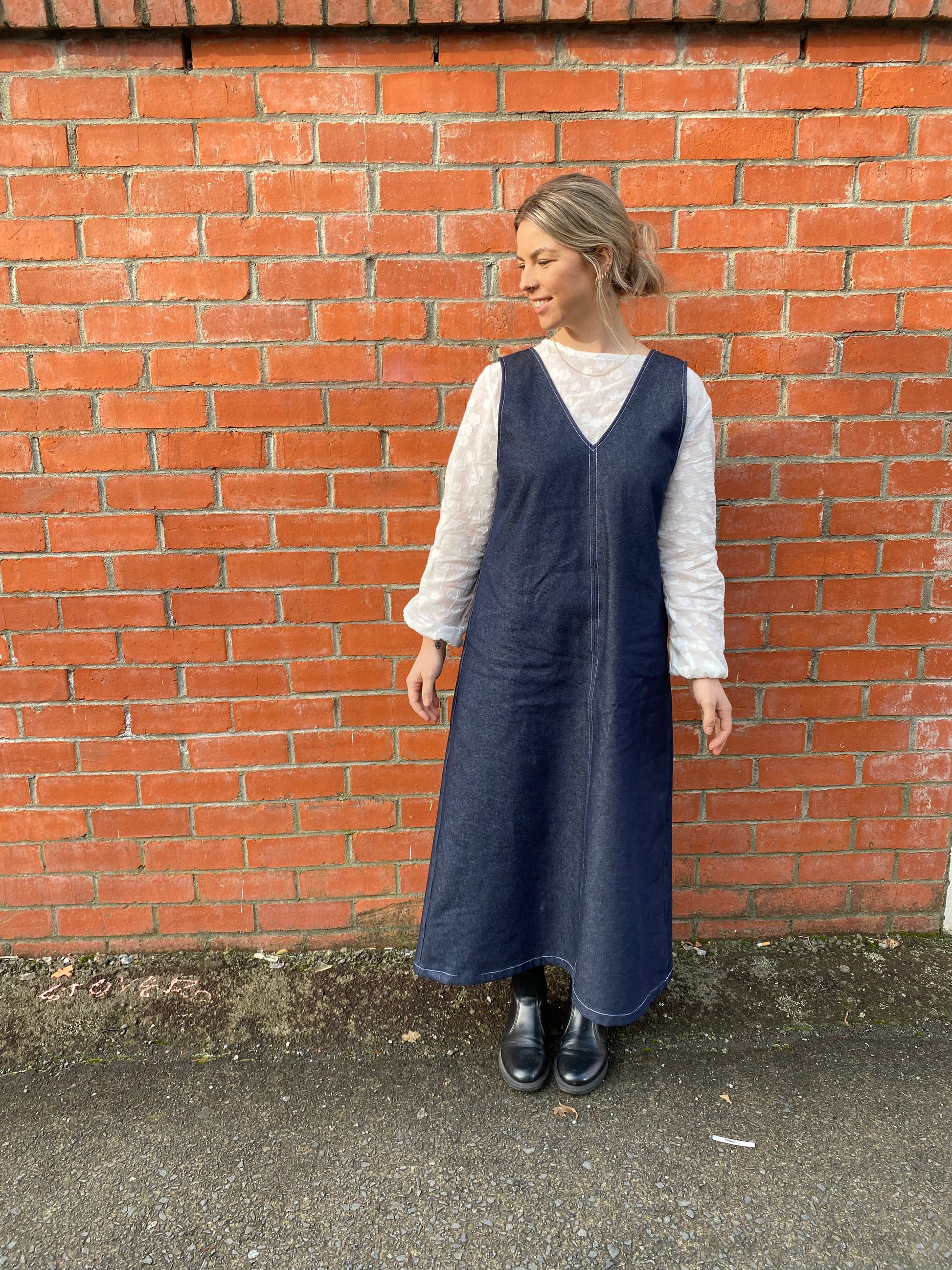 The Frankie Dress features a v-neck front which reflects to the back. She is an a-line cut with a seam down the centre front, finishing at an ankle grazer length. This dress is perfect for layering up with long sleeves to enjoy all year round.