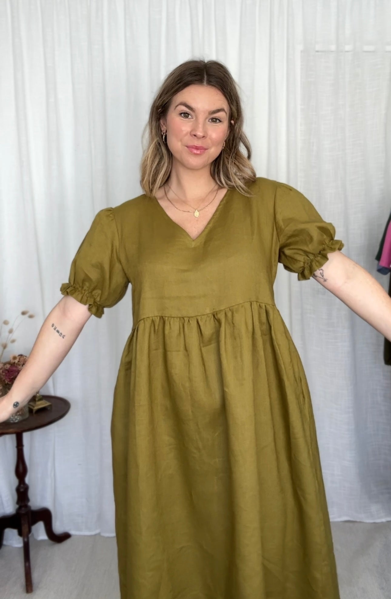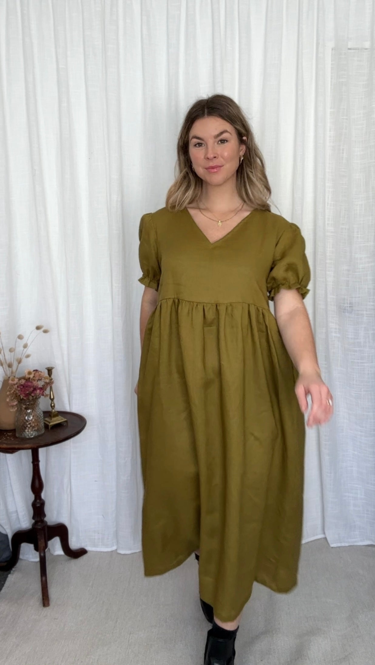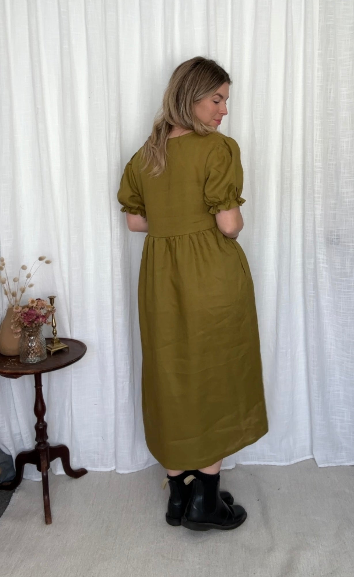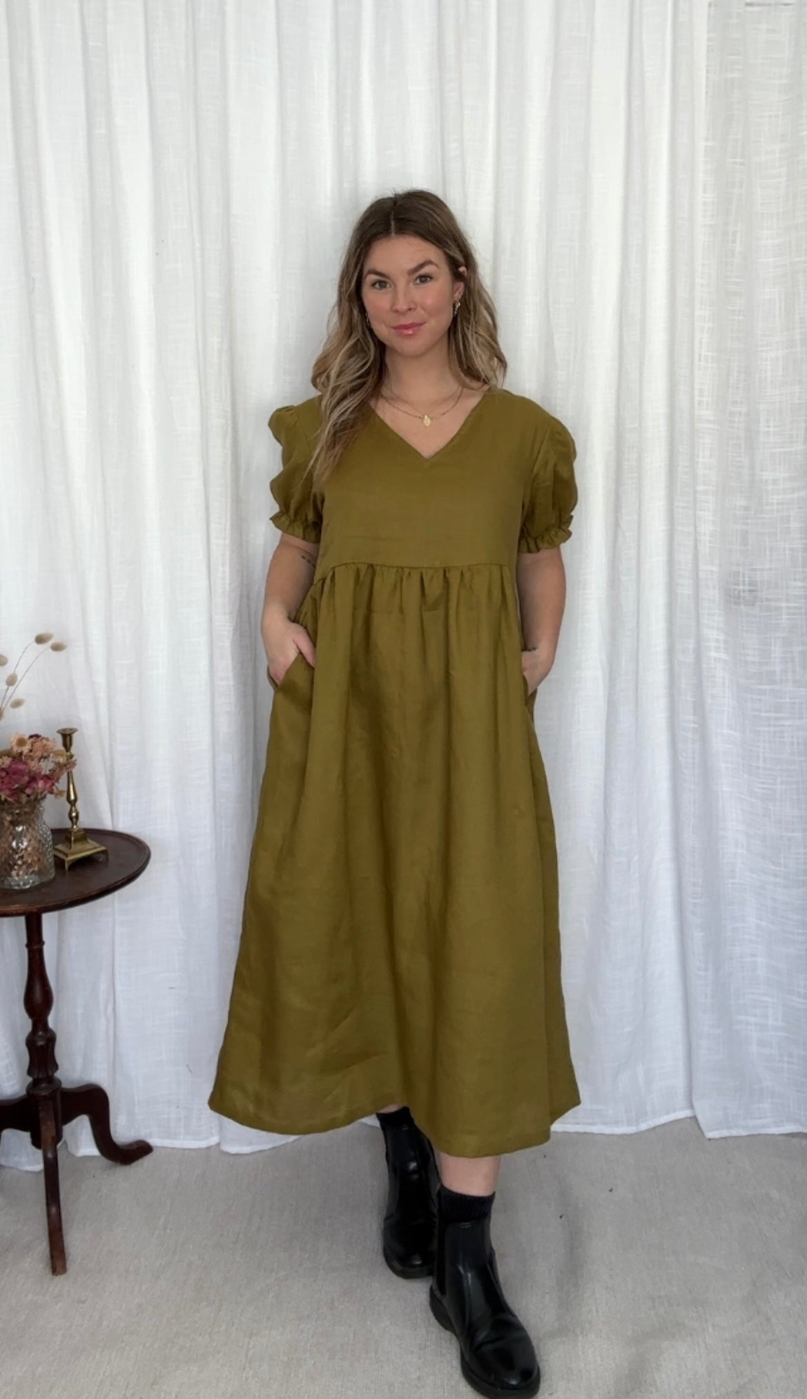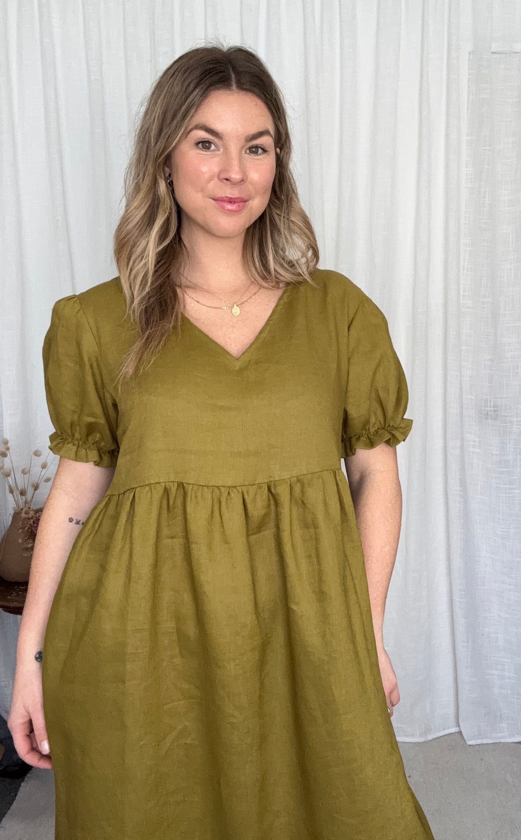 The Ivy Dress features a v-neck front, slightly puffed sleeves with an elastic finish. She has inseam pockets, a gathered waistline flowing down to a midi length finish.