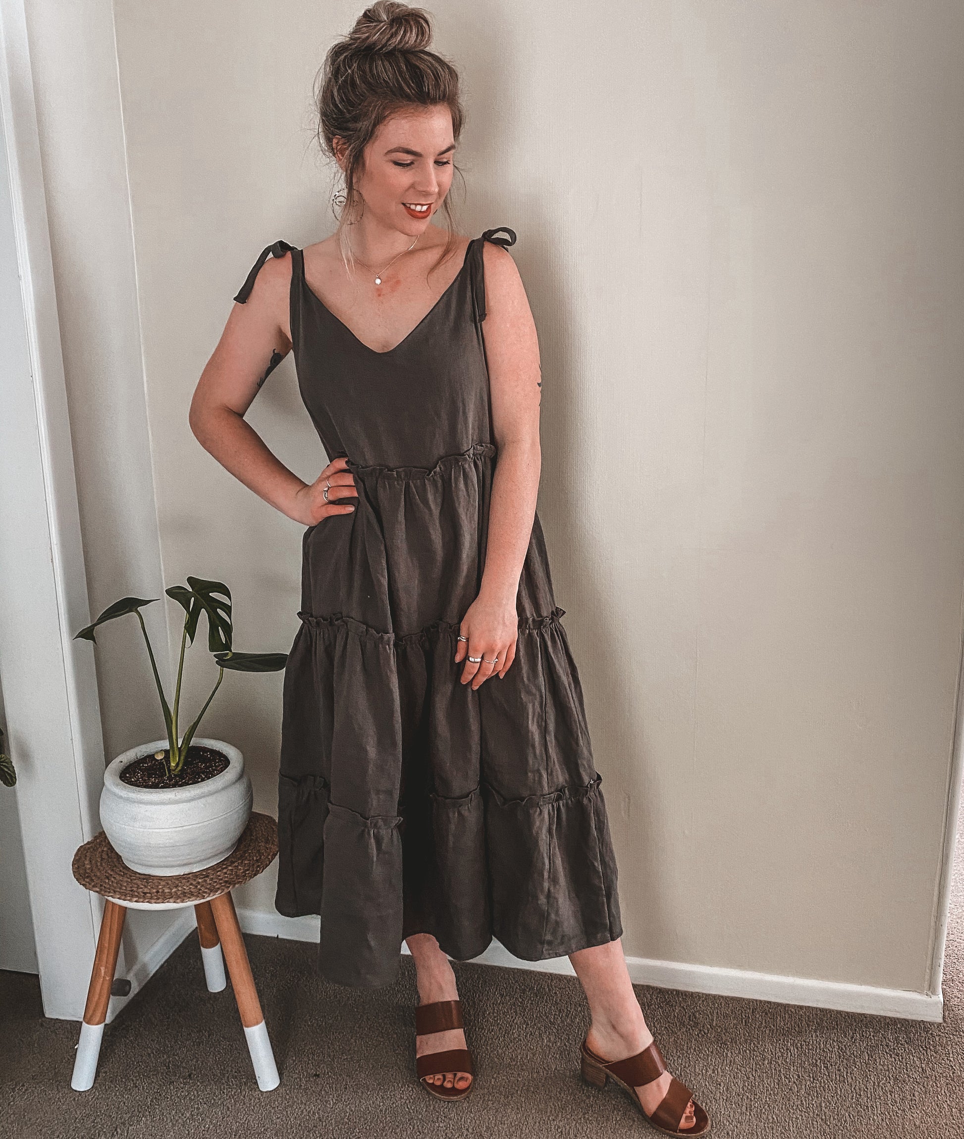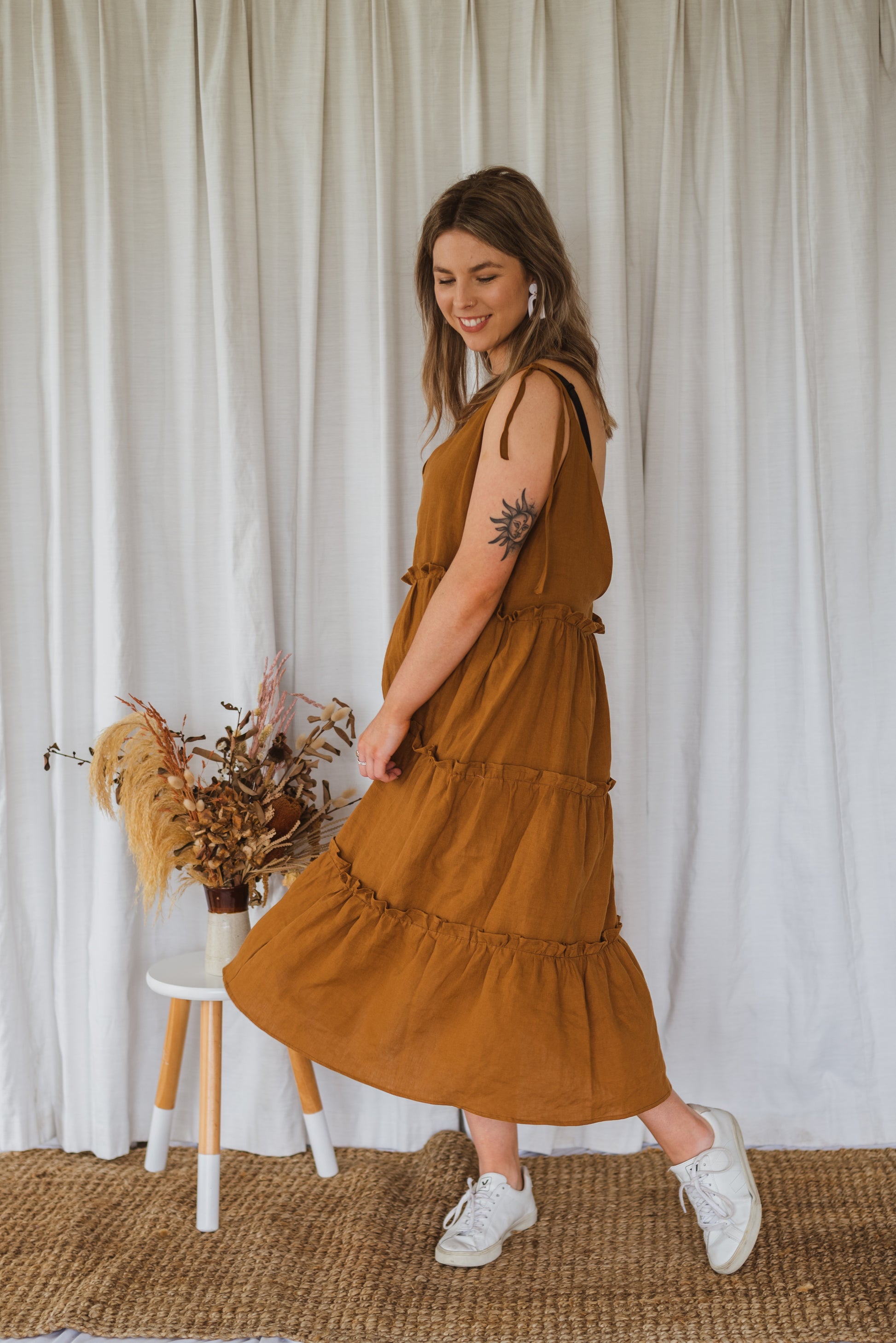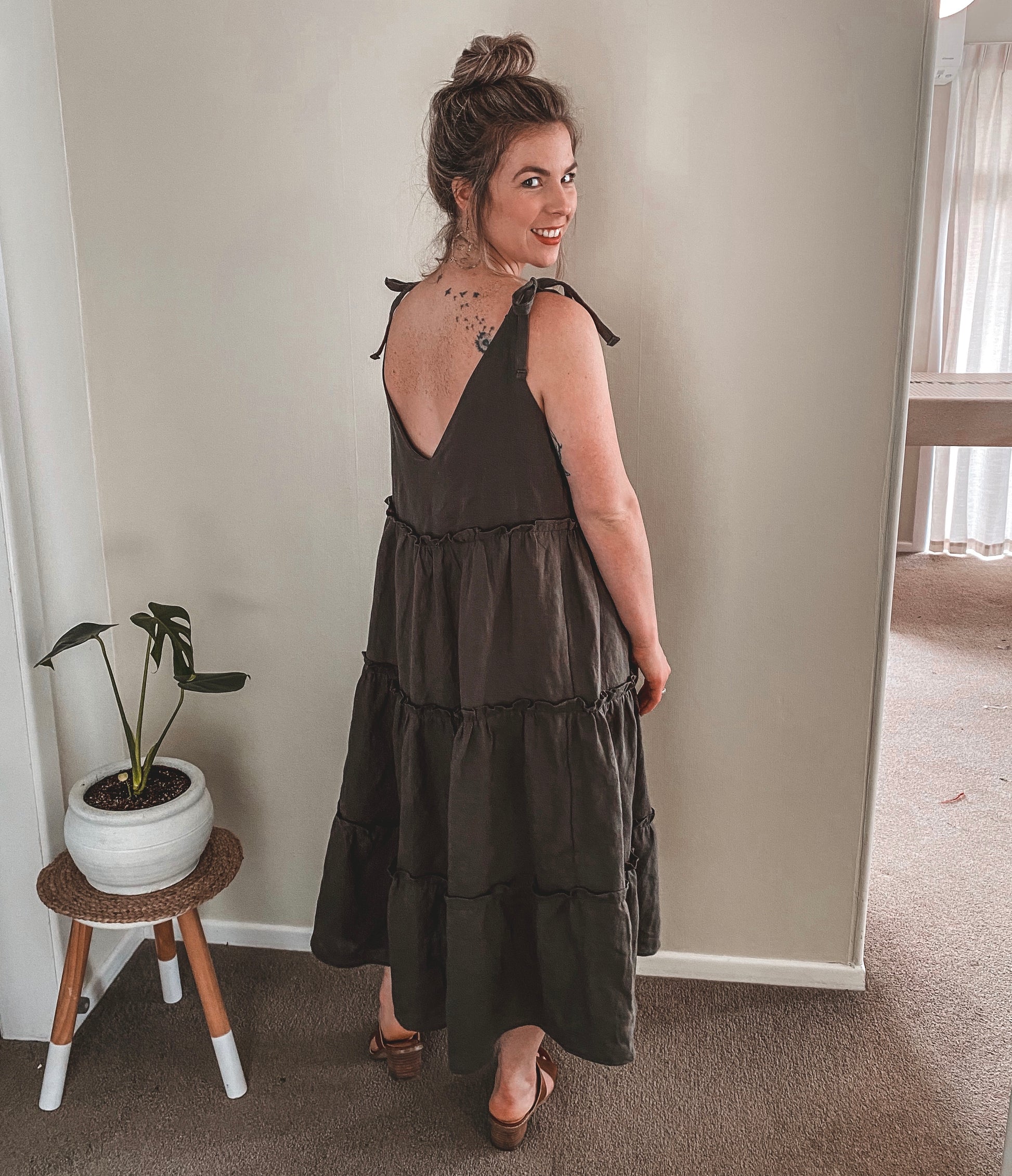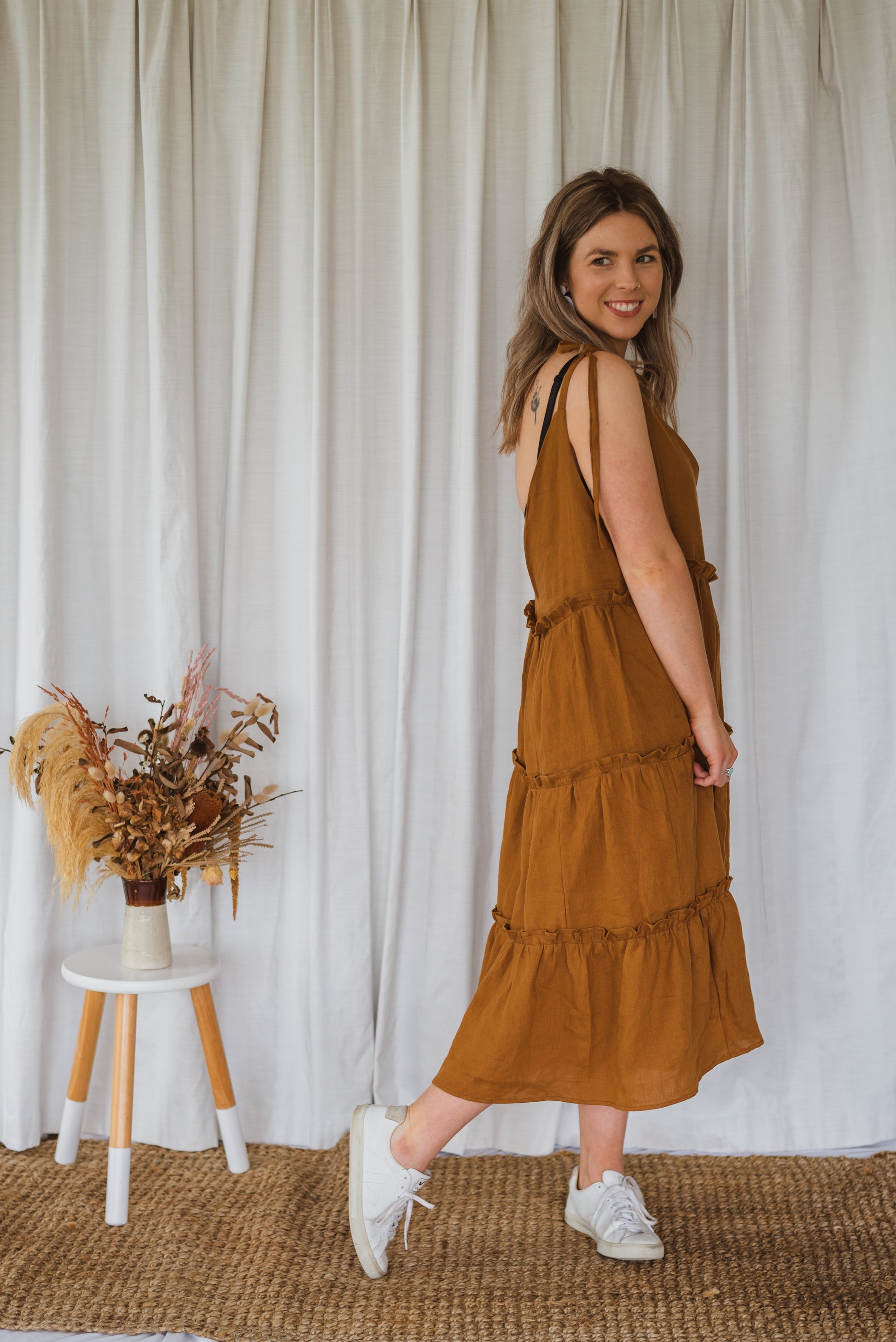 The Katy Dress a v-neck front with a deeper v at the back. She has three tiers starting at the waistline then finishing at a midi length. This dress as adjustable tie straps.