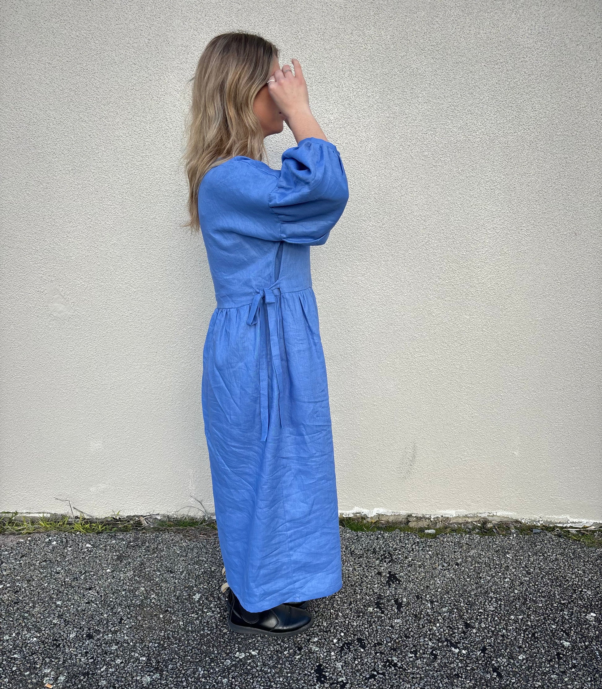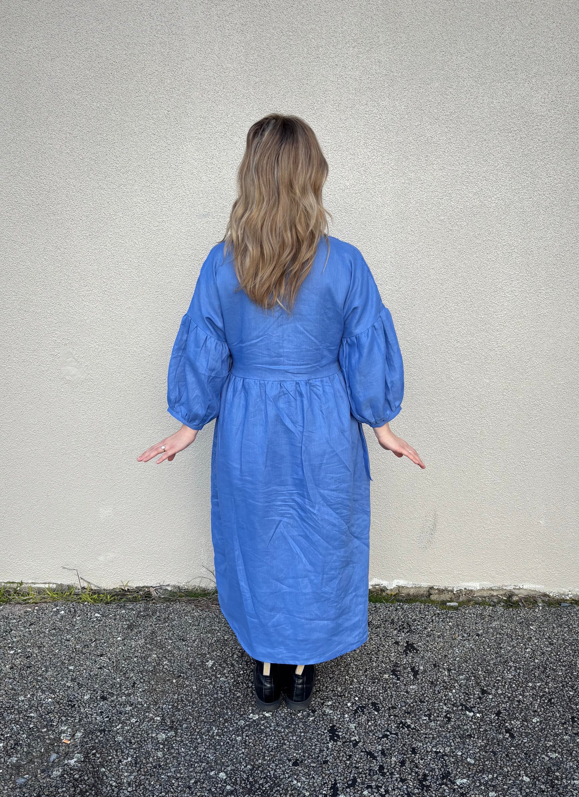 The Marley Dress is a relaxed-fitting garment that finishes at an ankle-grazer length. It features a grown-on sleeve with a gathered detail, finished with a bound edge for a clean look. The design also includes practical side pockets.
