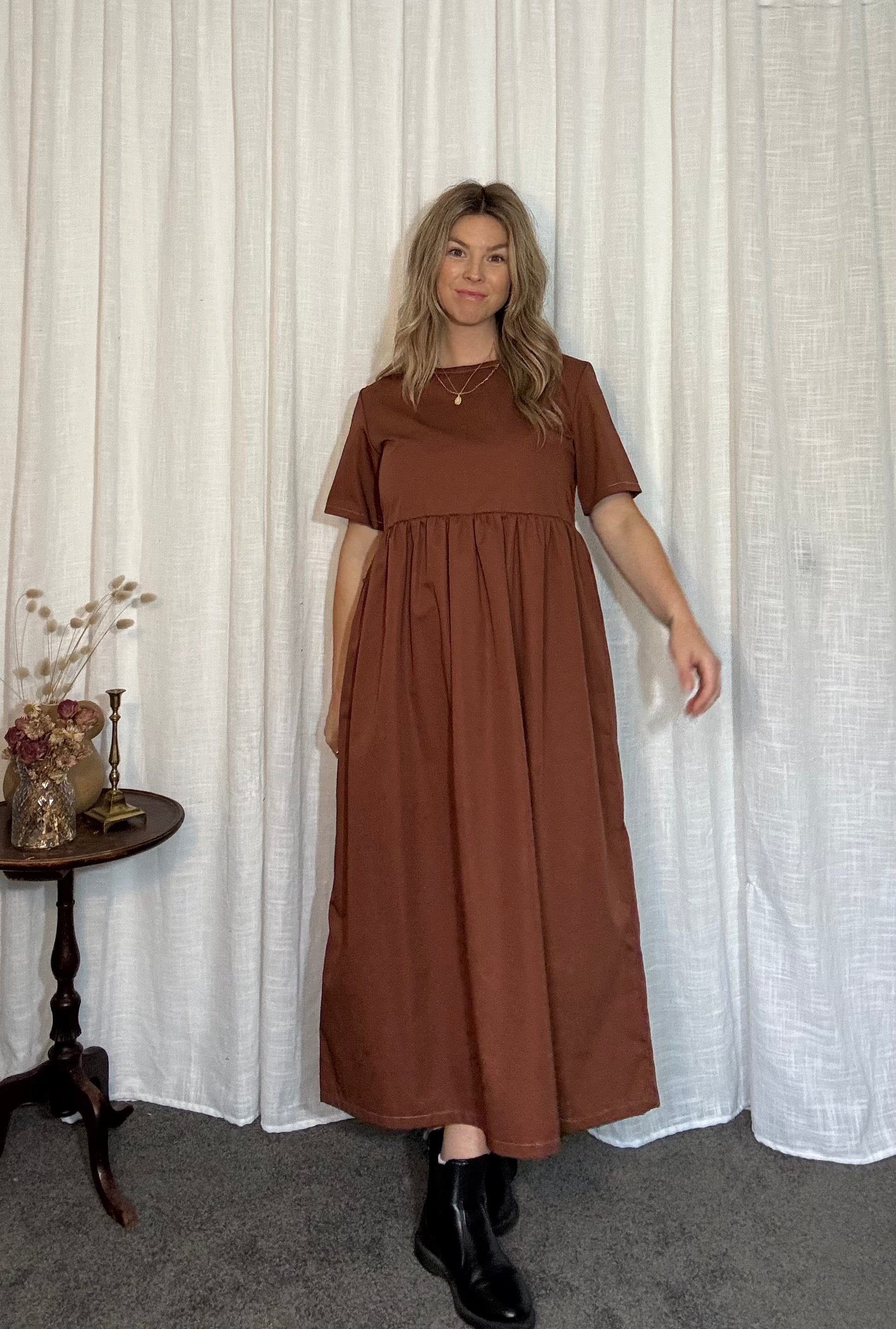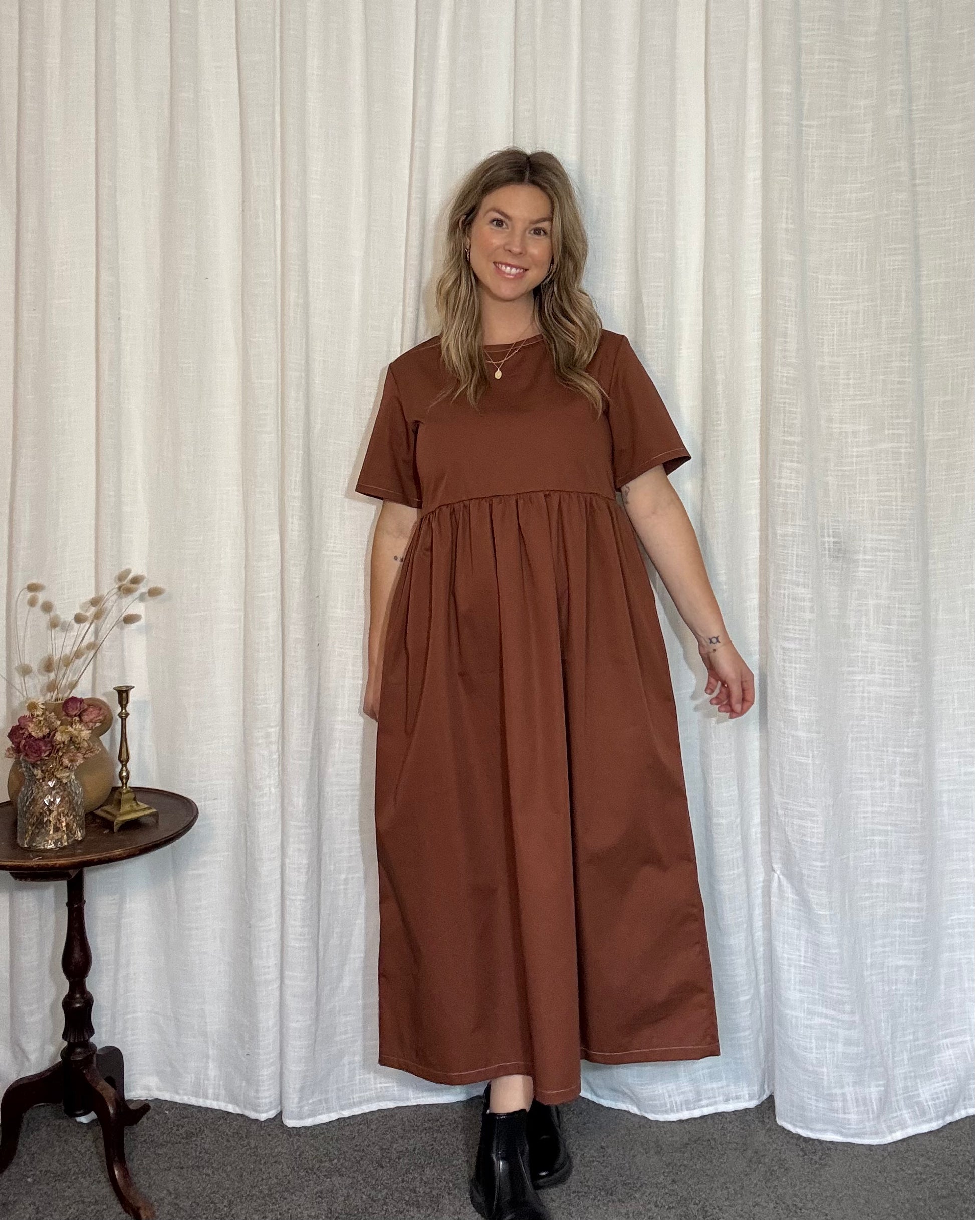 The Molly Dress has a crew neckline, inseam pockets, a gathered waistline and finishes at an ankle grazer length. This dress has white contrast stitching.