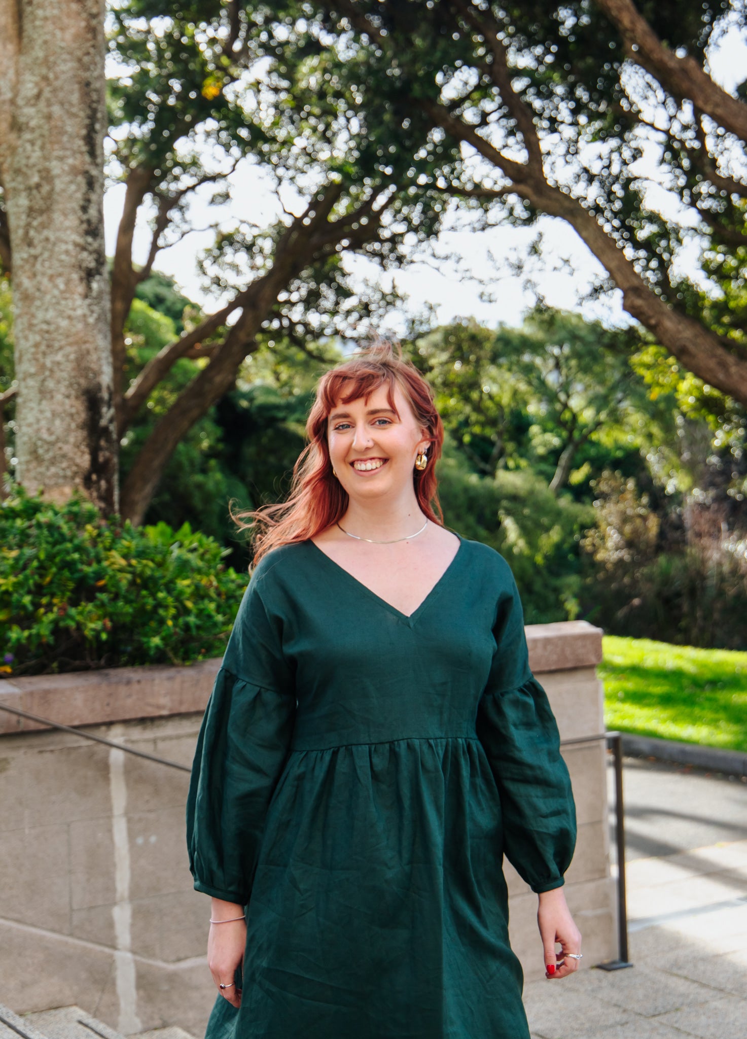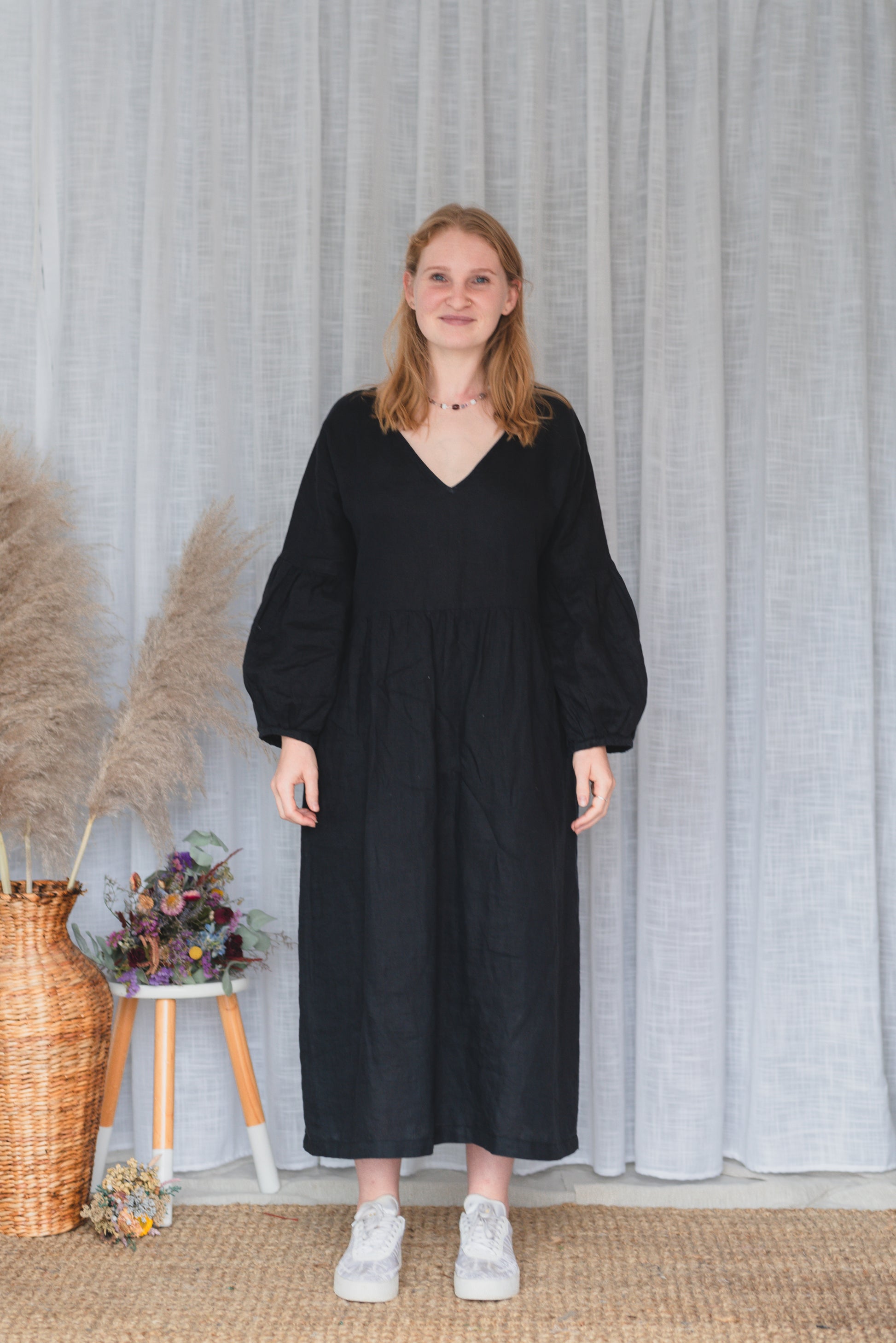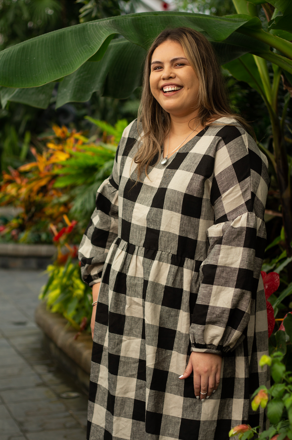 The Reverse Me Dress is a relaxed fitting, midi length dress that features the option to wear her as v-neck front or turn her around and wear as a round neckline! This dress has inseam pockets and layers up nicely with high neck long-sleeve.