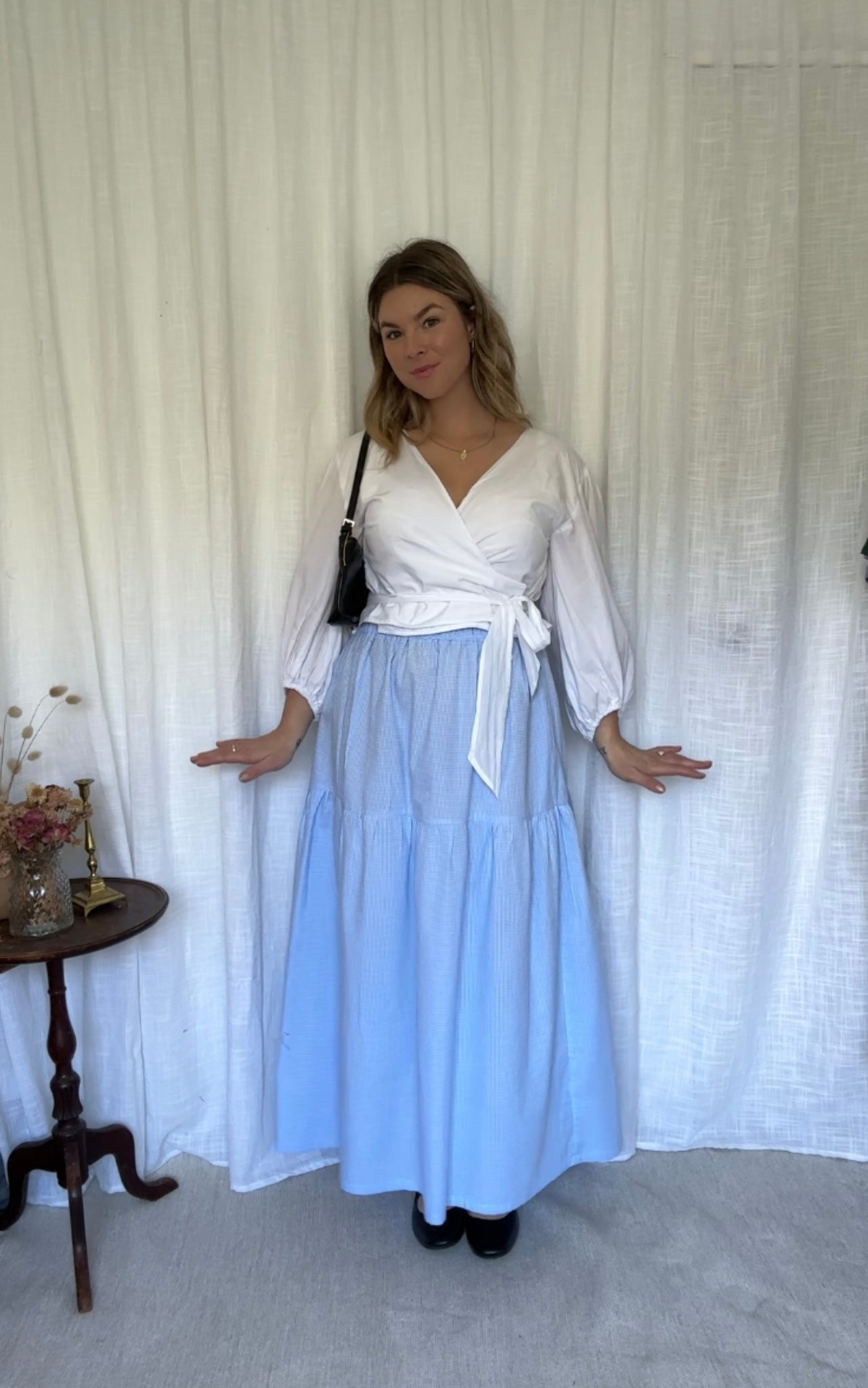 The Sofia skirt is a 2 tier, maxi length skirt. She has inseam pockets and an elastic waistband making her super comfortable and size versatile.
