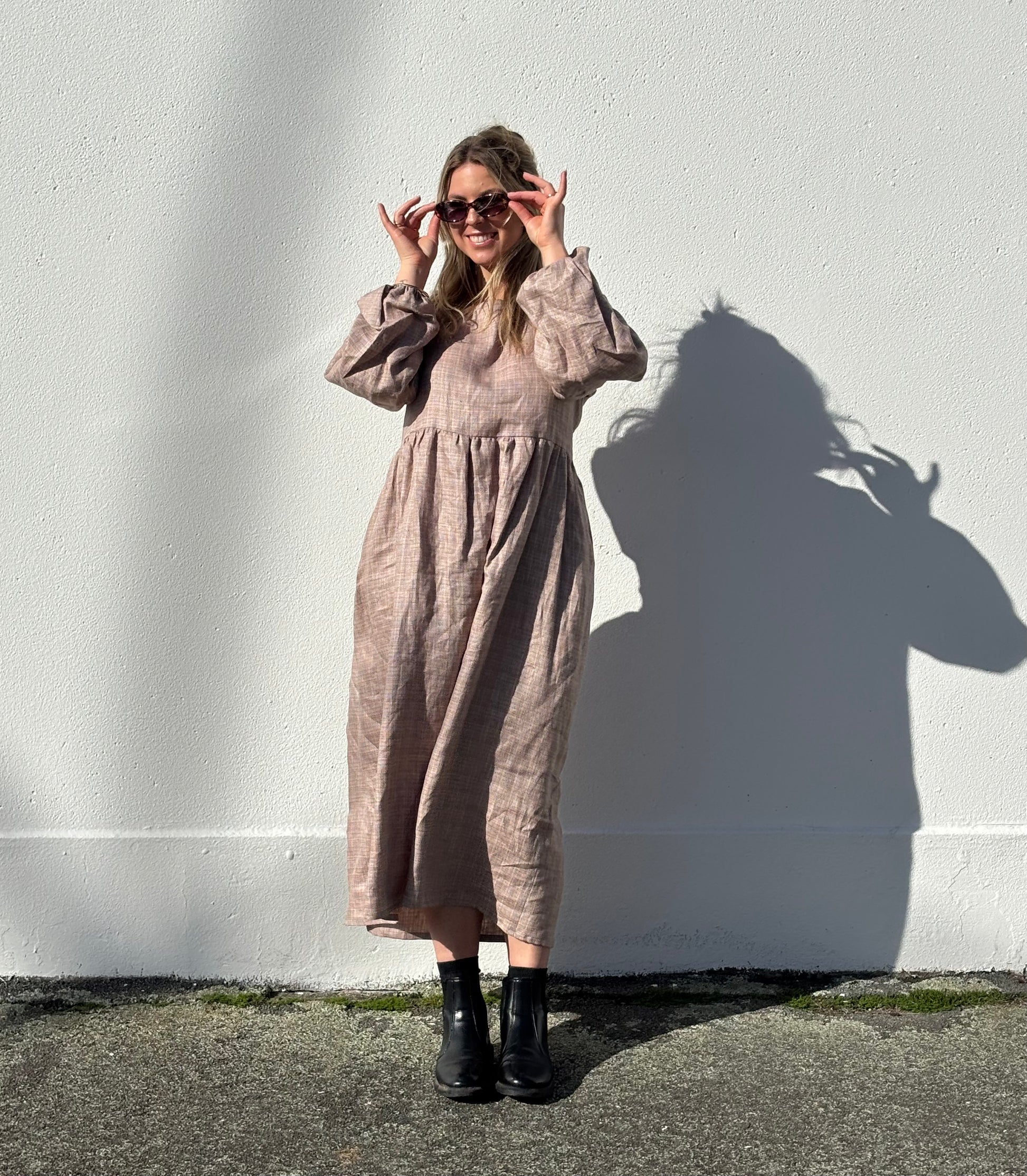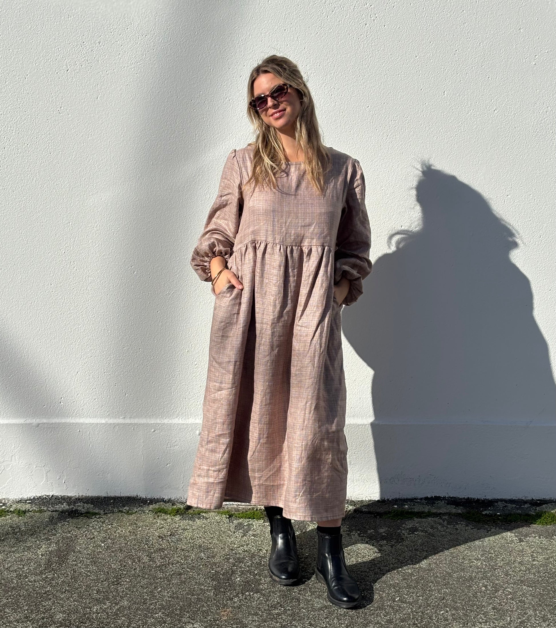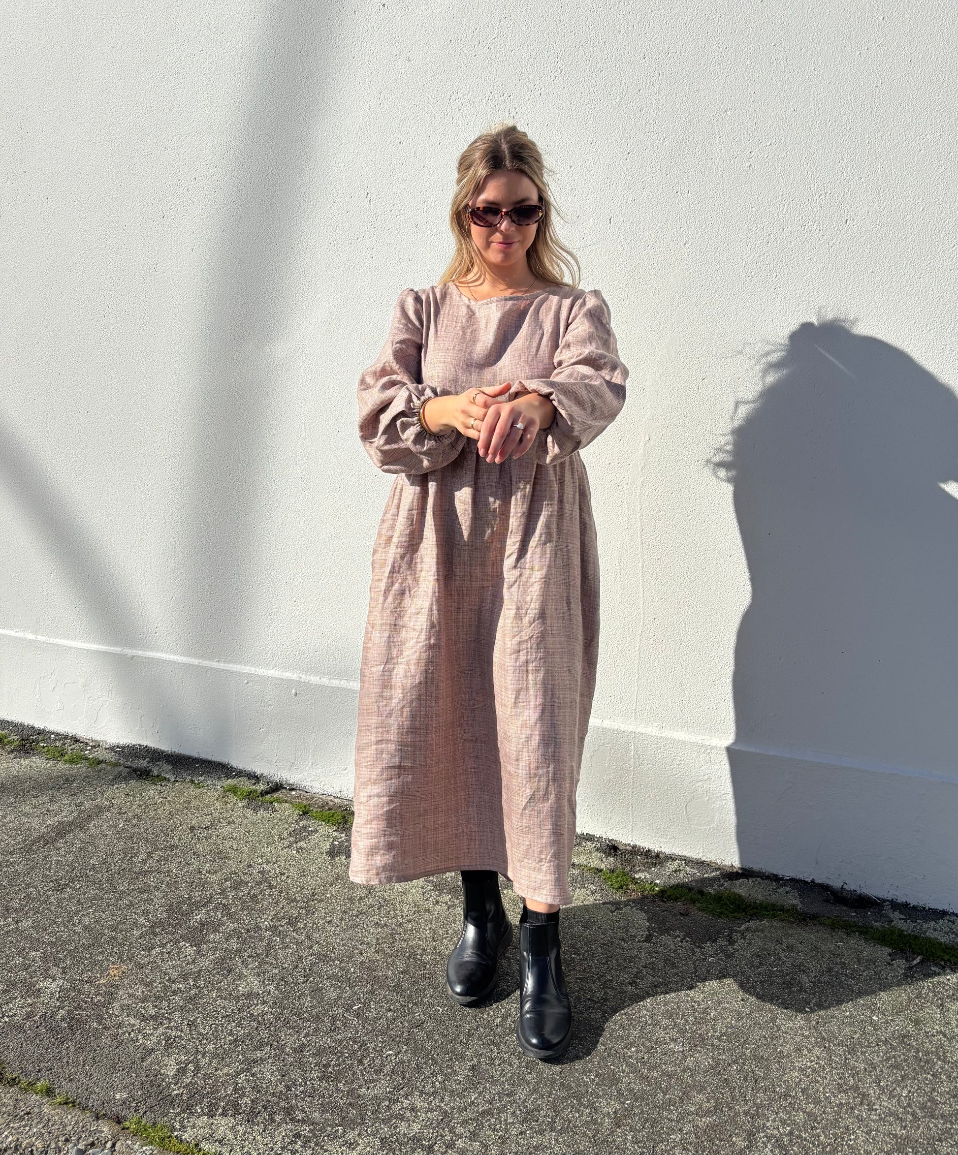 The Stevie Dress is a relaxed fitting dress that has full length sleeves with a gathered shoulder and an elasticated cuff. She has a slightly lowered waistline, inseam pockets and finishes at a midi length.