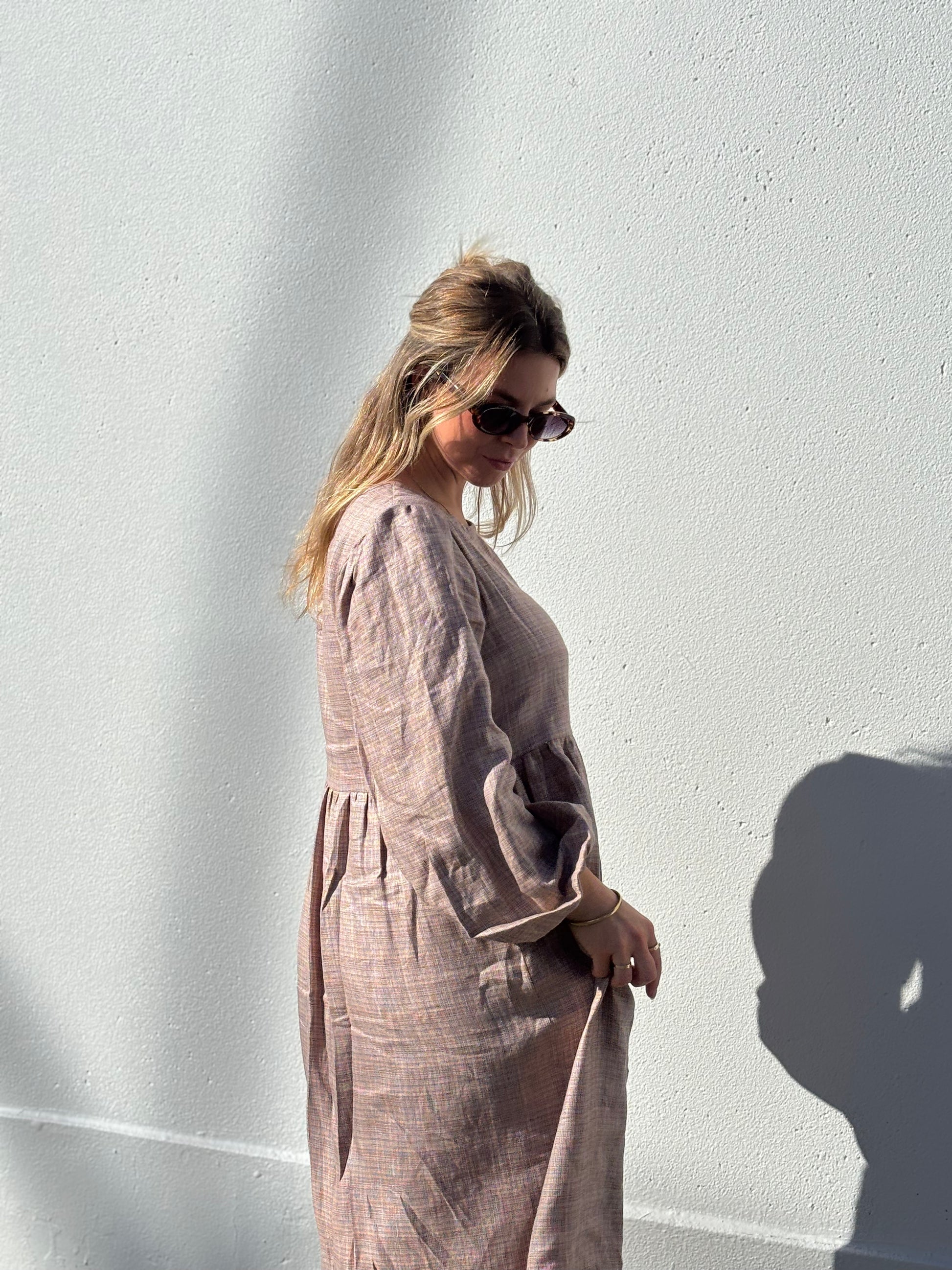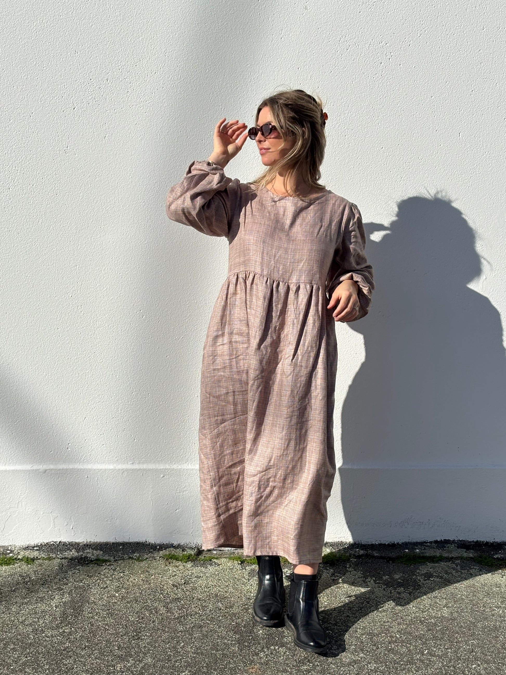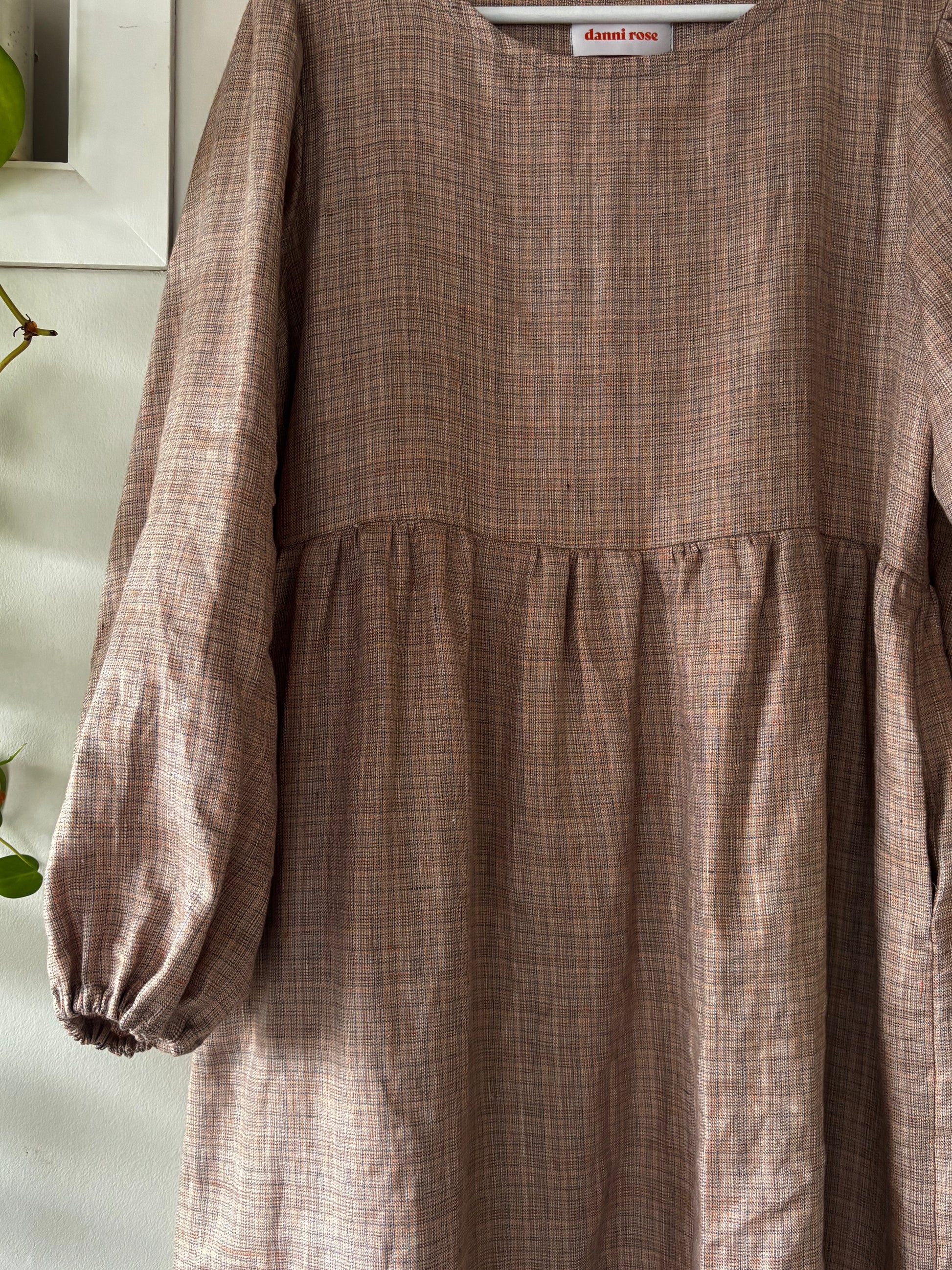 The Stevie Dress is a relaxed fitting dress that has full length sleeves with a gathered shoulder and an elasticated cuff. She has a slightly lowered waistline, inseam pockets and finishes at a midi length.